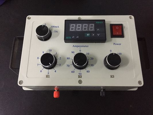 หลอดไฟในตัวมอเตอรจะถูกแทนที่ดวยวงจรทดสอบดังรูปที่ C.3 การทดสอบเริ่มต้นด้วยการทดสอบวงจรวงจรไฟและชุดควบคุมที่มีเสถียรภาพที่อุณหภูมิห้องของตู้ป้องกันร่าง เมื่อเปลี่ยนค่าความต้านทาน R ค่ากระแสไฟจะปรับเป็นค่าเท่ากับสองเท่าของกระแสไฟปกติ ไม่มีการปรับค่า R เพิ่มเติม