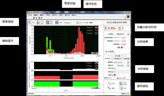 อินเทอร์เฟซซอฟต์แวร์ประกอบด้วยปุ่มการทำงาน ปุ่มเมนู อินเทอร์เฟซการแสดงเส้นโค้ง การตั้งค่าการวิเคราะห์ และผลการวิเคราะห์การตั้งค่าการวิเคราะห์และอินเทอร์เฟซการแสดงผลจะแสดงที่อินเทอร์เฟซด้านบนเพื่ออำนวยความสะดวกในการใช้งานของผู้ใช้ผ่านการสลับอินเทอร์เฟซ เส้นโค้งโดเมนเวลา เส้นโค้งระดับพลังงานการสั่นสะเทือน เส้นโค้ง 1 ≤ 3 octave เส้นโค้งสเปกตรัมพลังงาน และอินเทอร์เฟซการวิเคราะห์ข้อมูลทดสอบของกระบวนการวัดสามารถแสดงและสลับได้